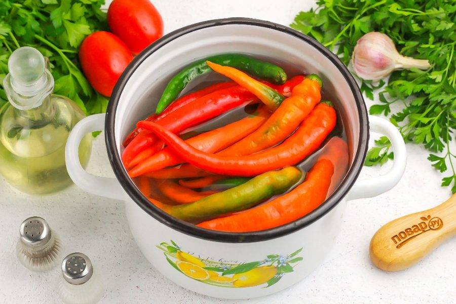 Отварите острые перцы примерно 10 минут. Ни в коем случае не нарезайте их и не протыкайте, весь вкус в семенах внутри перцев.