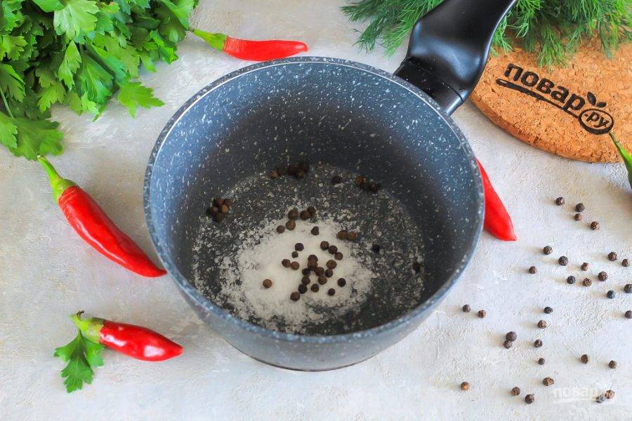 Всыпьте соль и горошины черного перца в ковш или кастрюлю. Слейте воду из банки в емкость и поместите ковш на плиту. Доведите до кипения и выключите нагрев. Влейте уксус и перемешайте.