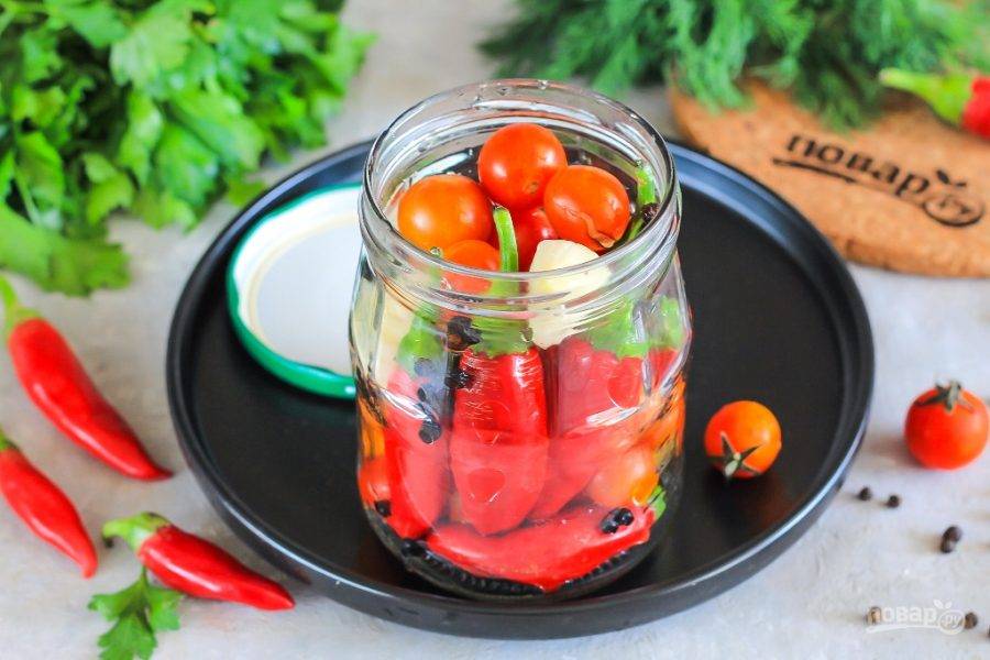 Залейте маринад в банку с овощами до верха и закрутите крышку по резьбе или с помощью ключа для консервации. Остудите при комнатной температуре и отправьте в кладовую, подвал, гараж.