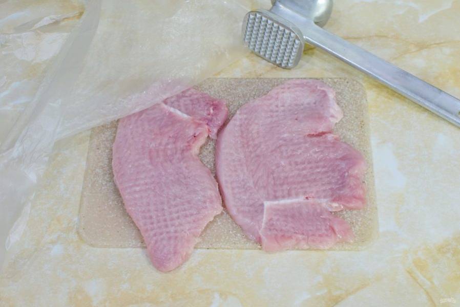 Мясо индейки отбейте кухонным молоточком. При отбивании накройте мясо пленкой.