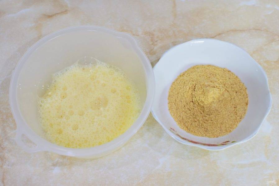 В одну чашу насыпьте панировочные сухари. В другую чашу разбейте яйца взболтайте их с солью и специями до легкой пены.
