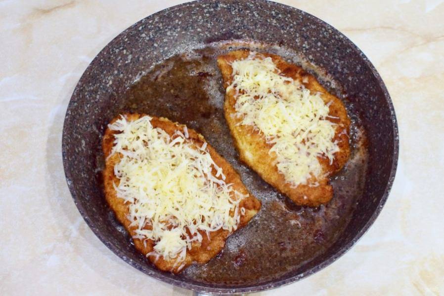 В конце жарки посыпьте отбивные тертым сыром и накройте крышкой на минуту, чтобы сыр расплавился.