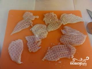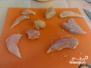 Куриное филе помыть, обсушить, нарезать кусочками.
