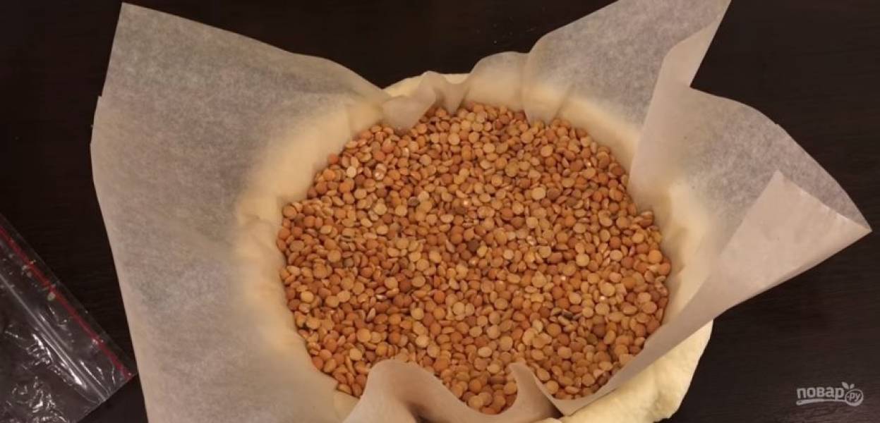 5. Форму смажьте растительным маслом, перенесите в нее тесто. Слегка придавите его, чтобы не было пустот, а край подрежьте, чтобы он не так сильно свисал. Выстелите пергамент на тесто и высыпьте груз (горох). Отправьте в разогретую до 180 градусов духовку и выпекайте до готовности.