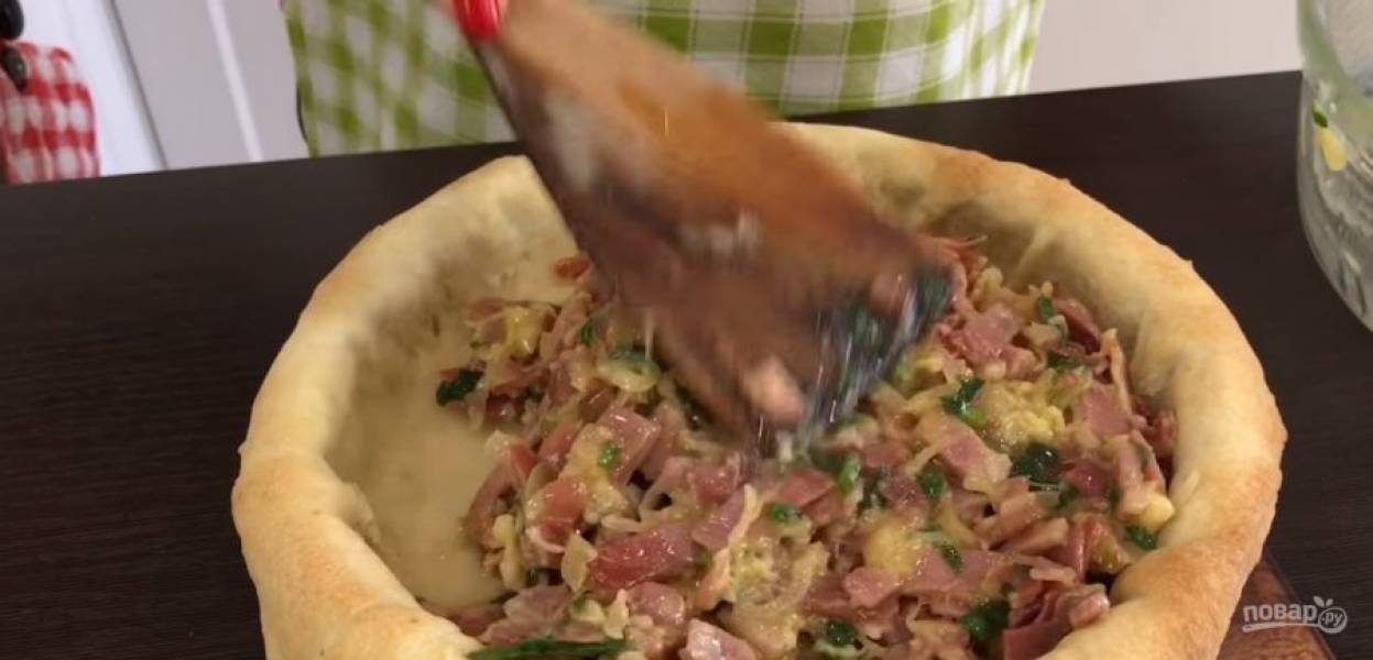 6. К бекону добавьте яйцо, перемешайте и выложите начинку на основу из теста. Посыпьте тертым сыром и отправьте в разогретую до 180 градусов духовку, чтобы расплавился сыр. Приятного аппетита!