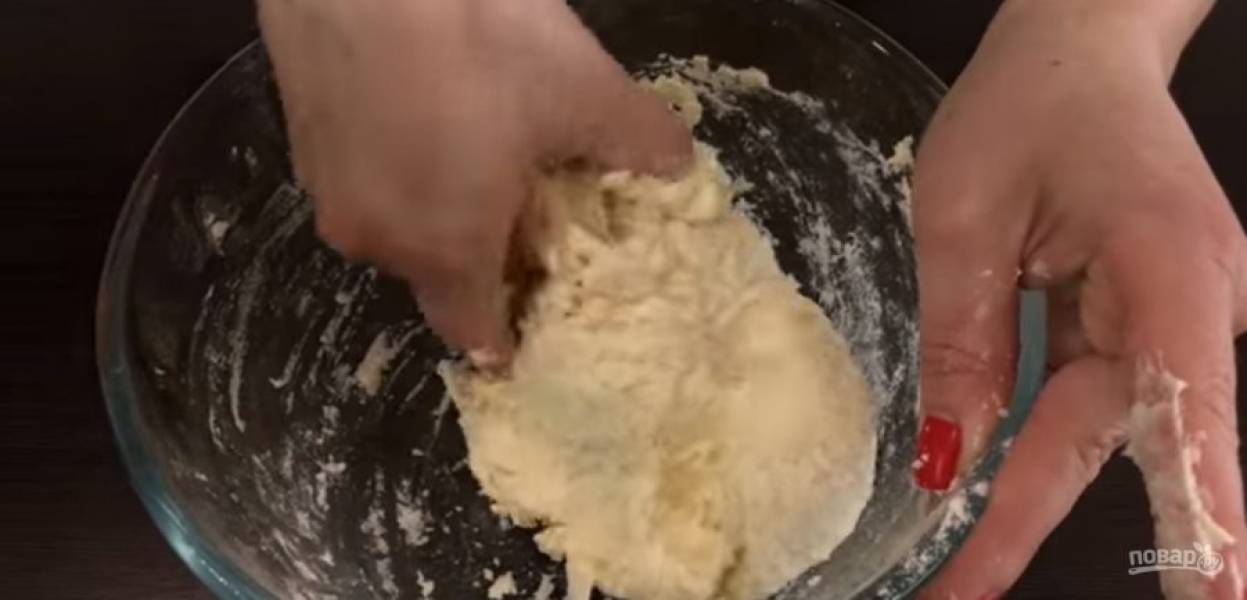 1. Сливочное масло заморозьте и натрите на крупной терке, перемешивая его с мукой. Перетрите муку с маслом до состояния однородной крошки. Добавьте сметану и соду с уксусом.