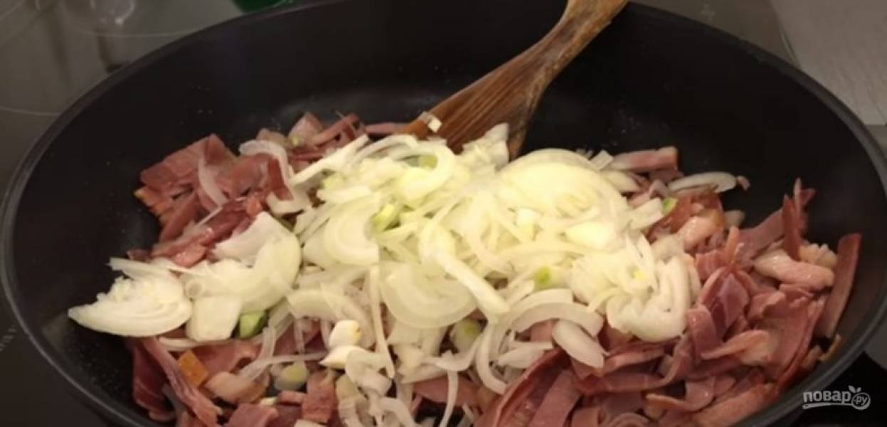 3. На сковороде разогрейте немного растительного масла и обжарьте бекон на среднем огне. Лук нарежьте полукольцами, а зеленый лук измельчите. Добавьте лук к бекону и обжарьте до полупрозрачности.