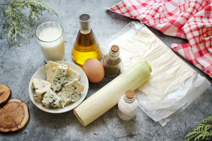Подготовьте все необходимые ингредиенты для приготовления открытого пирога с луком-пореем и горгонзолой. Слоеное тесто разморозьте.