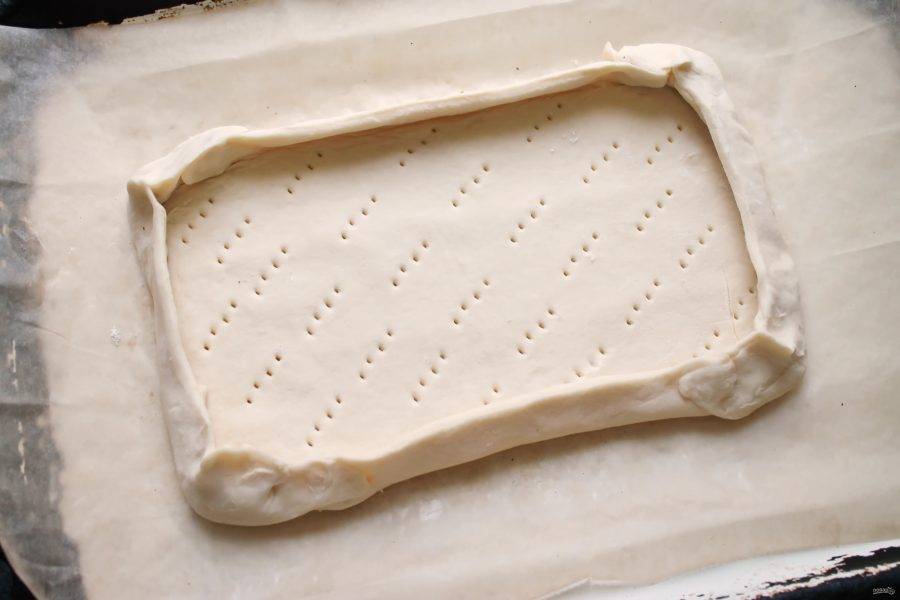Тесто немного раскатайте, переложите на пергамент и перенесите на противень. Надрежьте наискосок углы теста, поднимите края и сделайте бортики. Ножом сделайте неглубокие разрезы, не прорезая до конца, вдоль бортиков. Вилкой наколите дно теста. Поставьте в горячую духовку и выпекайте в течение 10 минут.