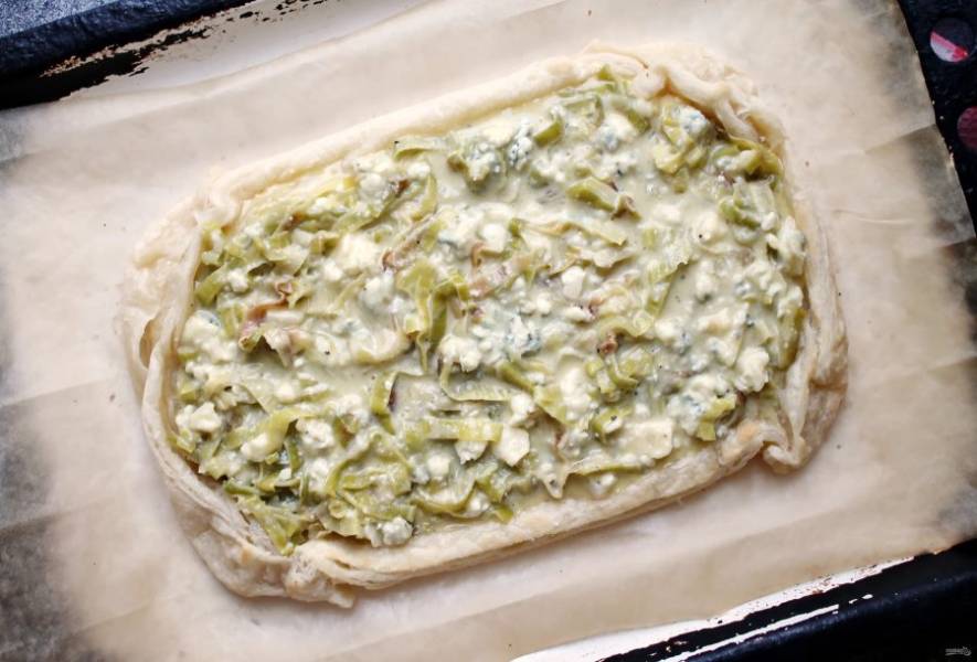 Открытый пирог с луком-пореем и сыром горгонзола