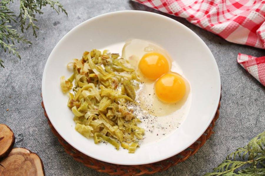В миску выложите остывший лук-порей, яйца, посолите, поперчите и перемешайте.