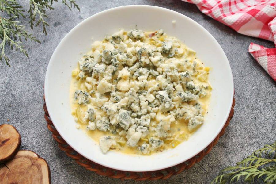 Раскрошите горгонзолу в миску с луковой массой и перемешайте.