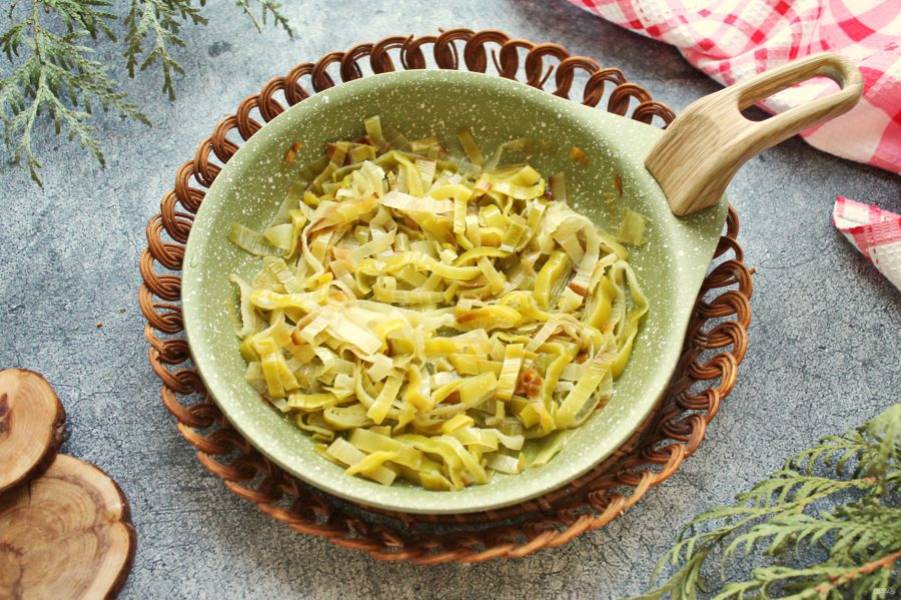 В сковороду налейте растительное масло, порей порежьте тонкими колечками и выложите в сковороду, посолите. Готовьте в течение 5-7 минут на среднем огне, перемешивая, до мягкости. Снимите сковороду с огня и остудите лук.