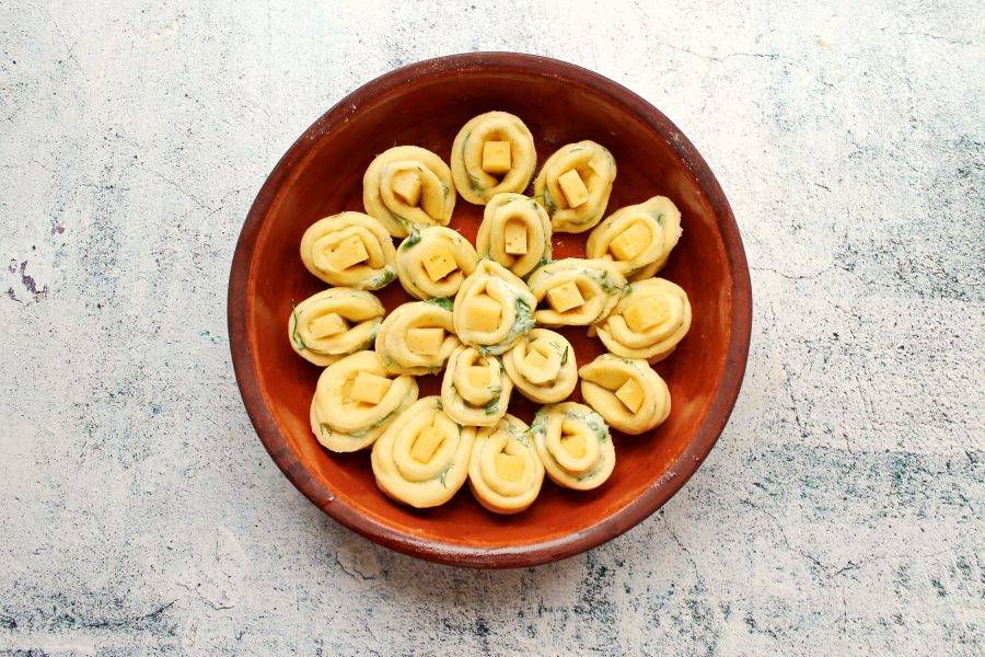 Сыр нарежьте на кусочки по количеству кружочков. Заготовки сложите пополам и выложите на середину по одному кусочку сыра.