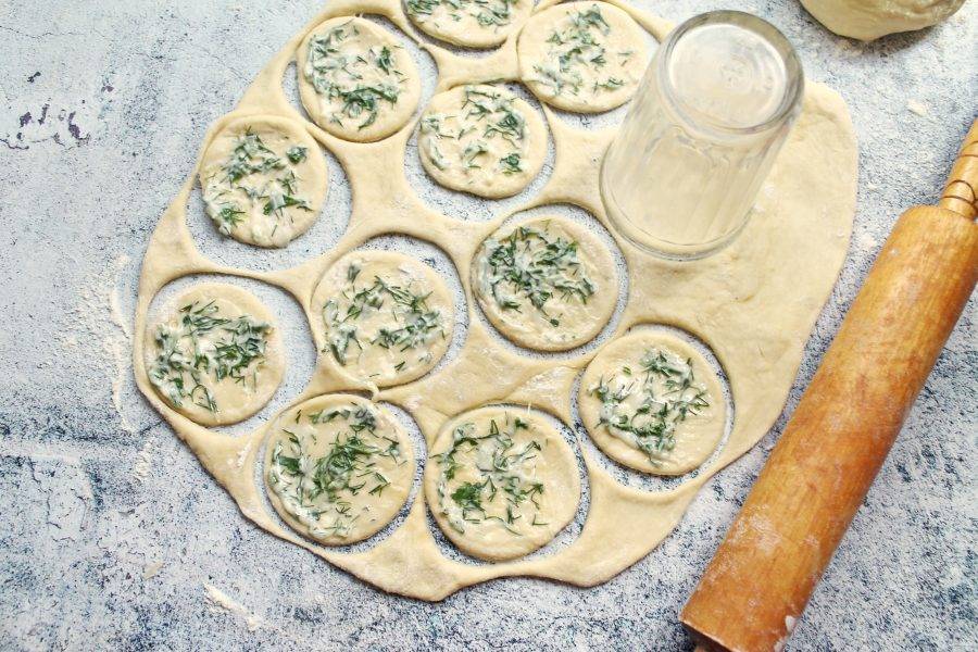 Тесто раскатайте в пласт и круглой формой вырежьте заготовки. Каждый кружочек смажьте масленой массой.