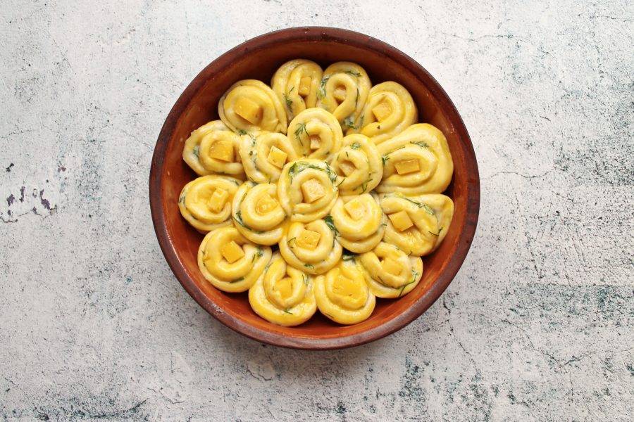 Заготовки сложите снова пополам и установите их в форму для запекания, смазанную растительным маслом, на расстоянии.