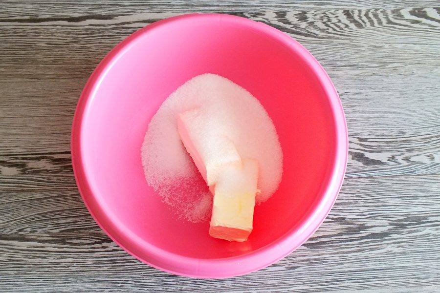 В чаше соедините маргарин комнатной температуры и сахар. Разотрите венчиком в однородную массу.