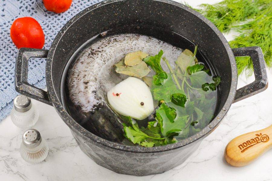 Влейте горячую воду, чтобы она покрывала щуку и поместите емкость на плиту. Доведите ее содержимое до кипения и убавьте нагрев до среднего.