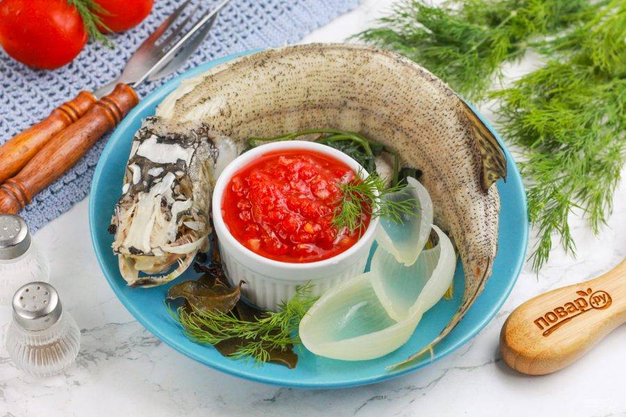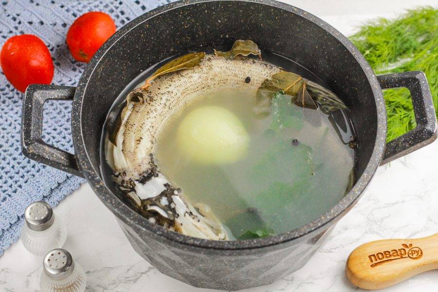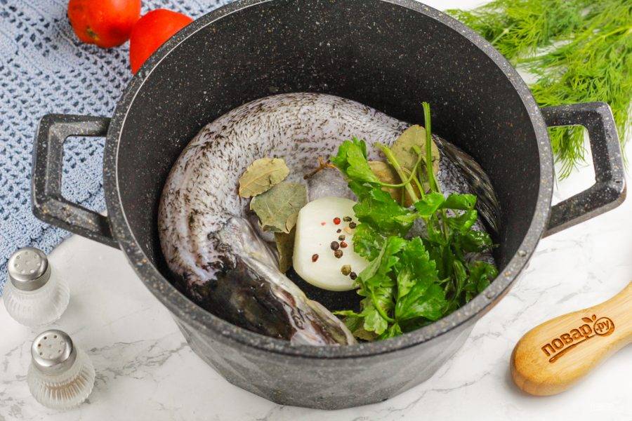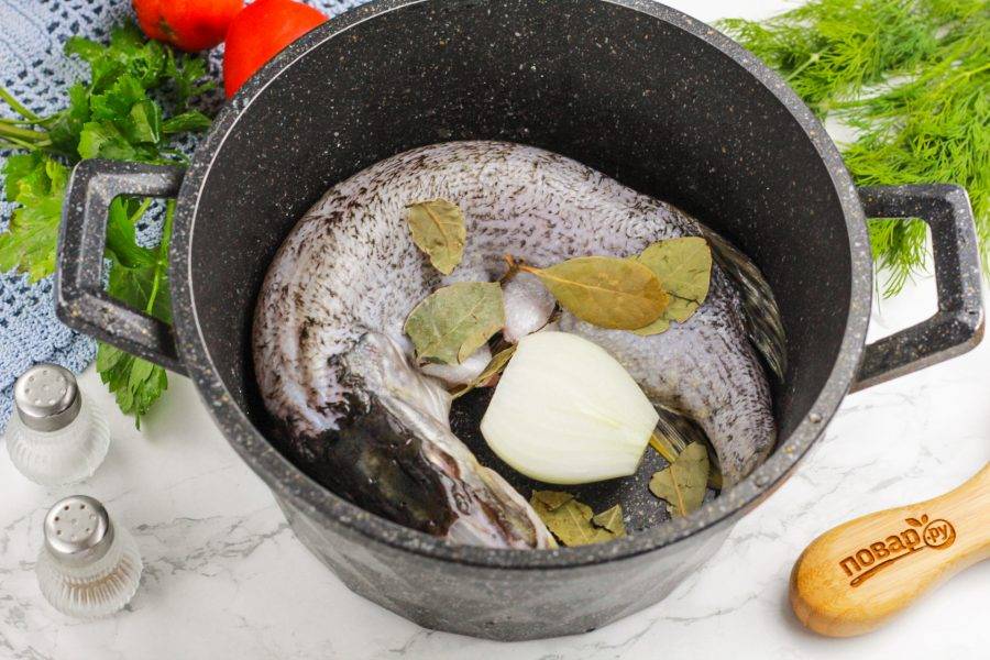 Выложите тушку рыбы в кастрюлю или казан, добавьте лавровые листья, лук.
