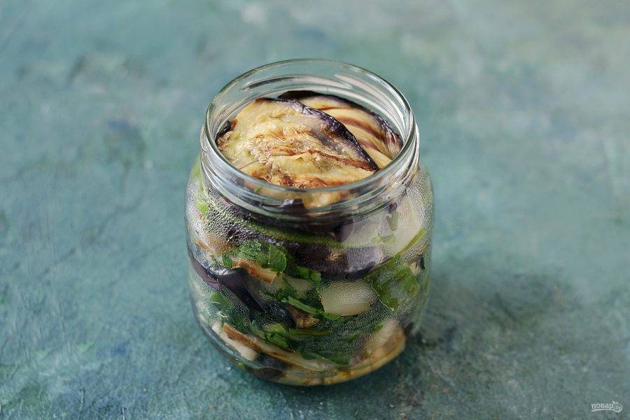 В банки плотно выложите овощи. Между слоями добавьте пару зубчиков чеснока нарезанных пластинами и мелко порубленную петрушку.