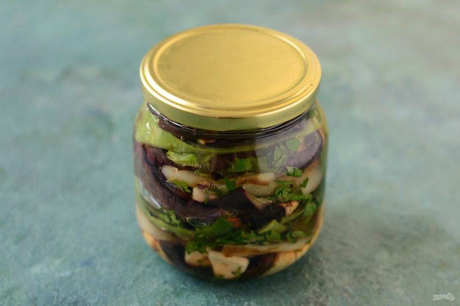 Залейте маринадом. Накройте крышкой, простерилизуйте банки 20 минут. Закрутите плотно крышки.
