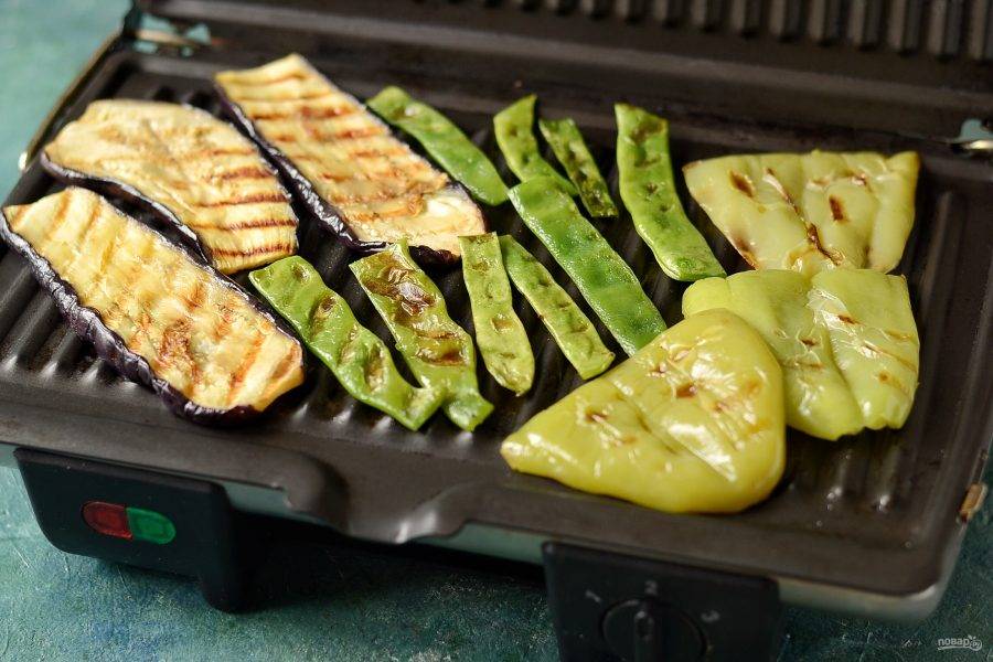 Обжарьте все овощи на гриле с двух сторон. Баклажаны и перцы жарьте по 5 минут с каждой стороны, стручковой фасоли достаточно 2-3 минуты.