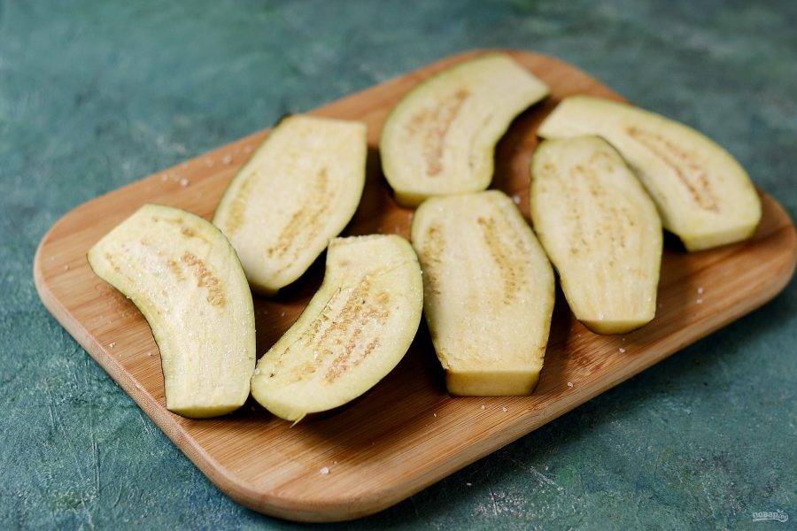 Баклажаны помойте, нарежьте полосками. Подсолите. Подождите 10 минут, затем промойте в холодной воде и отожмите.