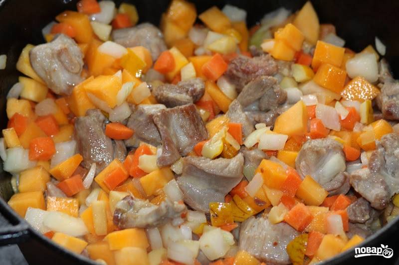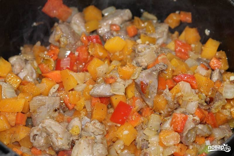 4. После того как индейка приобрела золотистую корочку, добавляю тыкву, луковицу, морковку, перемешиваю все и готовлю 7-10 минут.