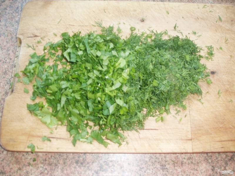2. Зелень и стебли сельдерея мою, вытираю бумажным полотенцем и мелко измельчаю.