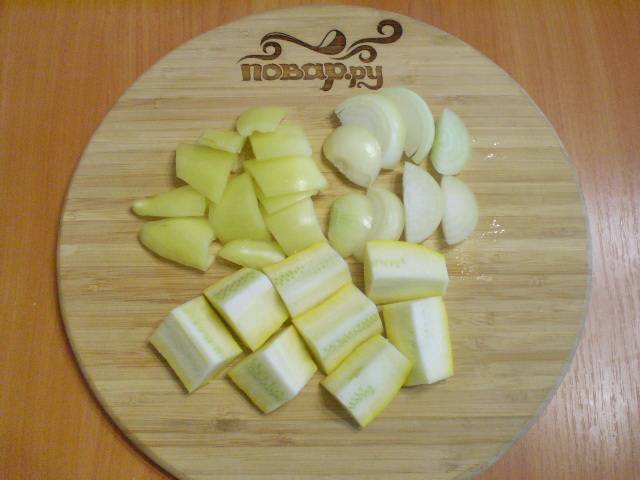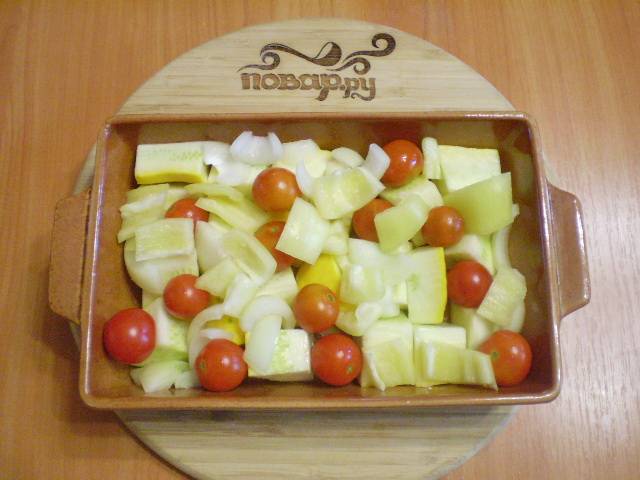 Смазываем противень. Выкладываем в произвольном порядке овощи.