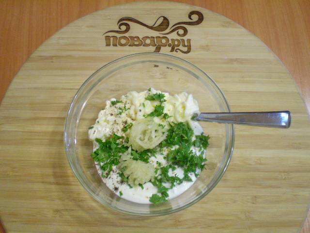 Для соуса смешиваем майонез со сметаной, зеленью, специями. Также добавляем пропущенный через пресс чеснок, соль.