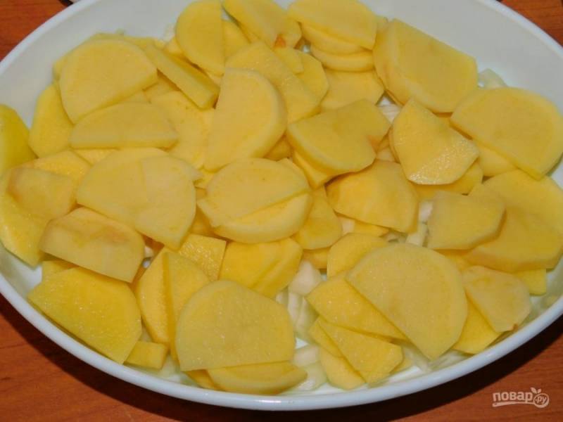 Выложите картофель, нарезанный кружками. Посолите немного.
