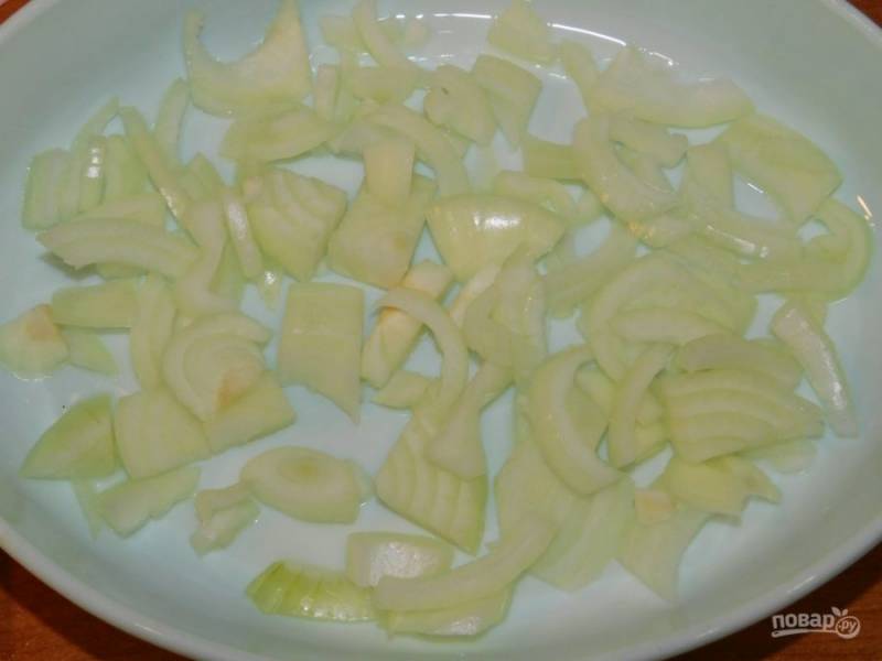 Лук нарежьте и выложите на дно формы для запекания, смазанной маслом.