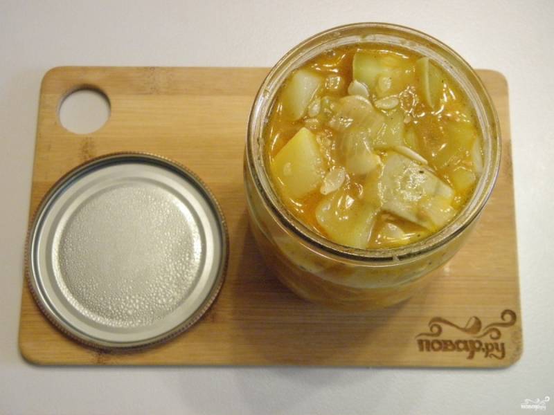 Готовое овощное рагу разложите по баночкам (стерильным) и закатайте стерильными крышками. Переверните вверх дном, накройте одеялом и оставьте до утра, а после уберите в прохладное место для хранения.