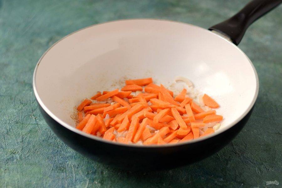 Морковь помойте, очистите и нарежьте брусочками. Добавьте в сковороду, обжарьте примерно 3-4 минуты.
