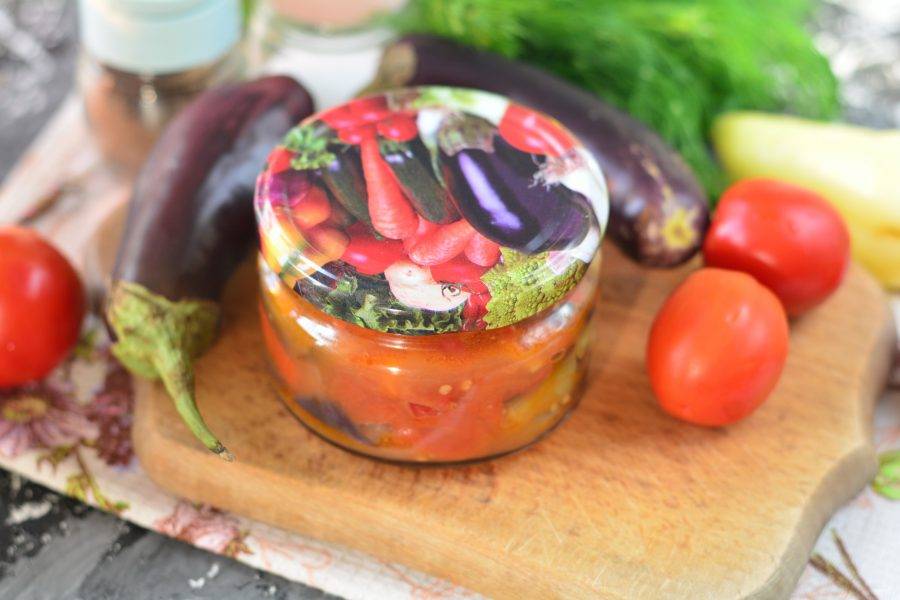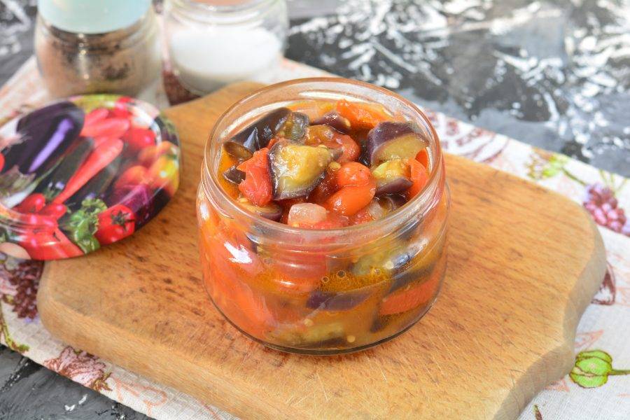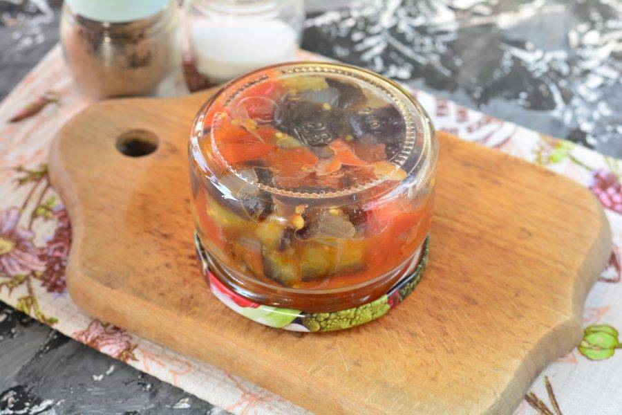 Храните закуску заготовку в темной кладовой или погребе. Выход — две баночки по 0,35 литра.