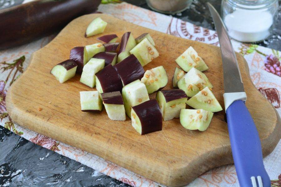 Нарежьте баклажаны крупными кубиками.