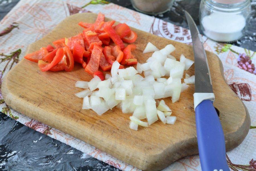Почистите от шелухи лук, удалите семена из сладкого перца. Нарежьте средними кубиками репчатый лук и болгарский перец. Сладкий перец используйте любого цвета: красный, желтый или зеленый.