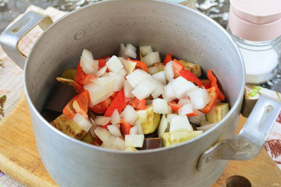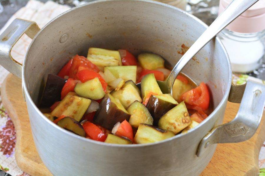 На дно кастрюли влейте масло и начинайте складывать овощи. Сперва всыпьте в кастрюлю баклажаны.