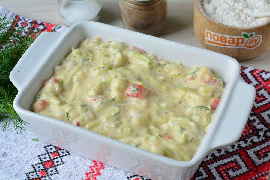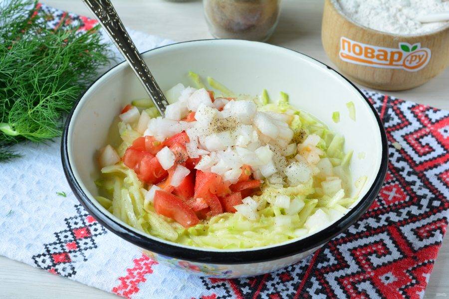 Всыпьте овощи в тесто, добавьте соль и черный перец по вкусу.