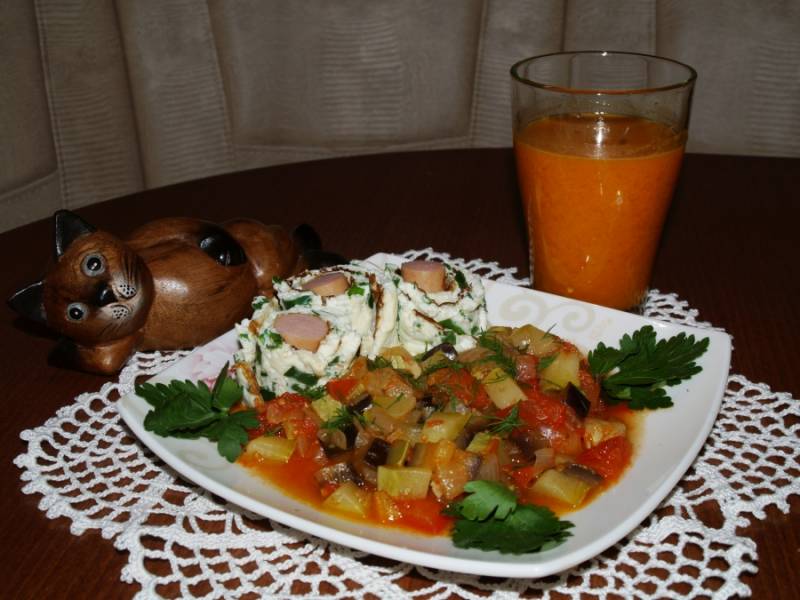 Овощной рататуй, рулетики из омлета и облепиховый морс