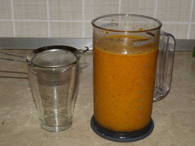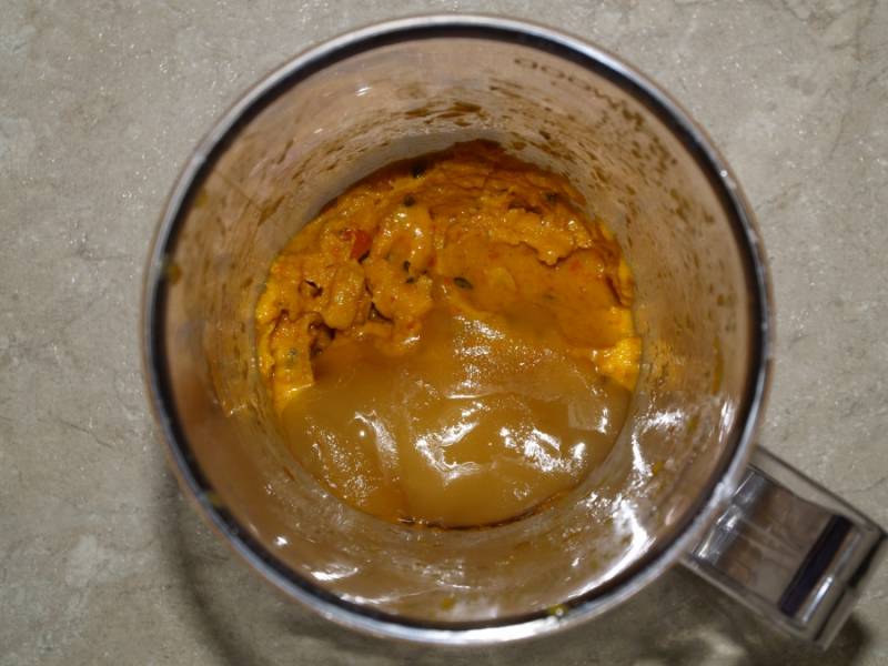 В то время пока жарится омлет, готовим морс. Облепиху пробиваем блендером, добавляем мёд и пробиваем ещё раз