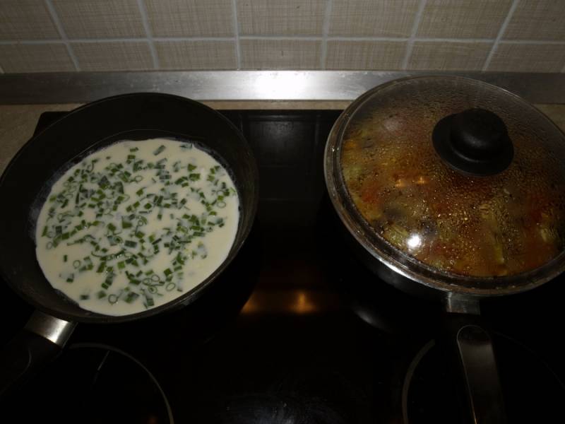 За время пока тушится рататуй, приготовим рулетики и морс. В миске взбиваем яйца и молоко, добавляем покрошенный лук. Сковороду смазываем маслом и хорошо разогреваем. Выливаем половину смеси. Жарить под крышкой 1-2 минуты, снять сковородку и поставить на что нибудь холодное, что бы омлет хорошо отлип от сковородки. Положить сосиску на омлет и свернуть рулетиком. Переложить на тарелку. То же проделываем со второй частью смеси.