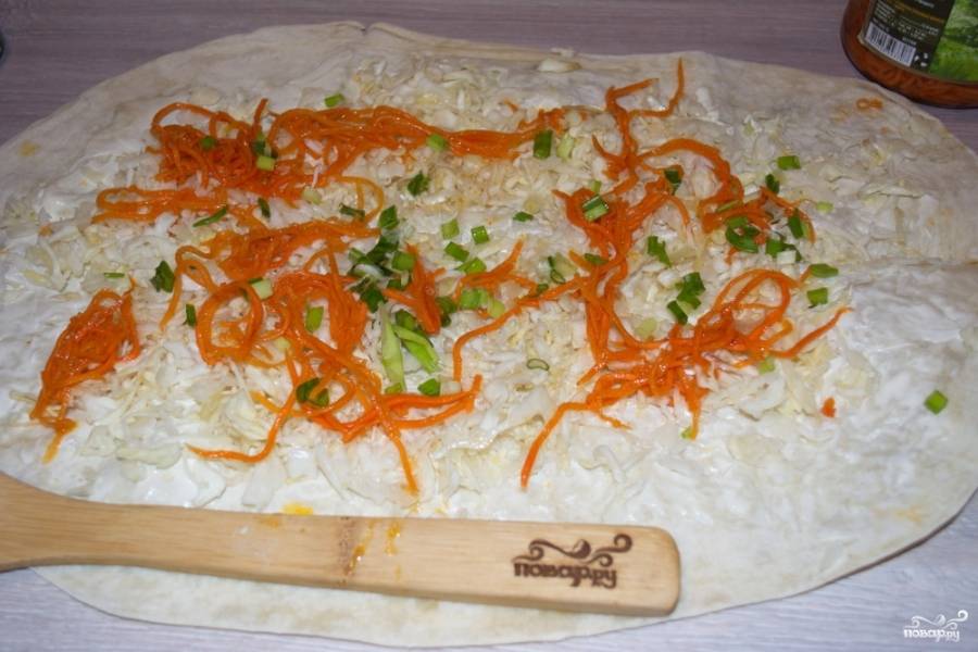 Лист лаваша с одной стороны нужно смазать майонезом. Нашинкуйте белокочанную капусту. Она — самое лучше в это время года. Капусту посолите и поперчите. Добавьте немного сахара. Помните капусту руками, чтоб она дала сок. Теперь распределите капусту по всему лавашу.