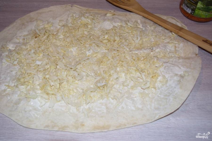 Лист лаваша нужно расстелить на столе. Под лист лаваша лучше подложить пищевую пленку. Это поможет аккуратнее и без дыр свернуть рулет.