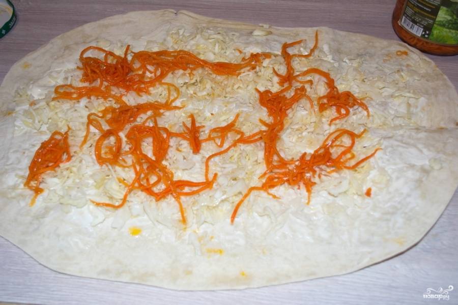 Морковь по-корейски отожмите от маринада и распределите сверху на капусте.