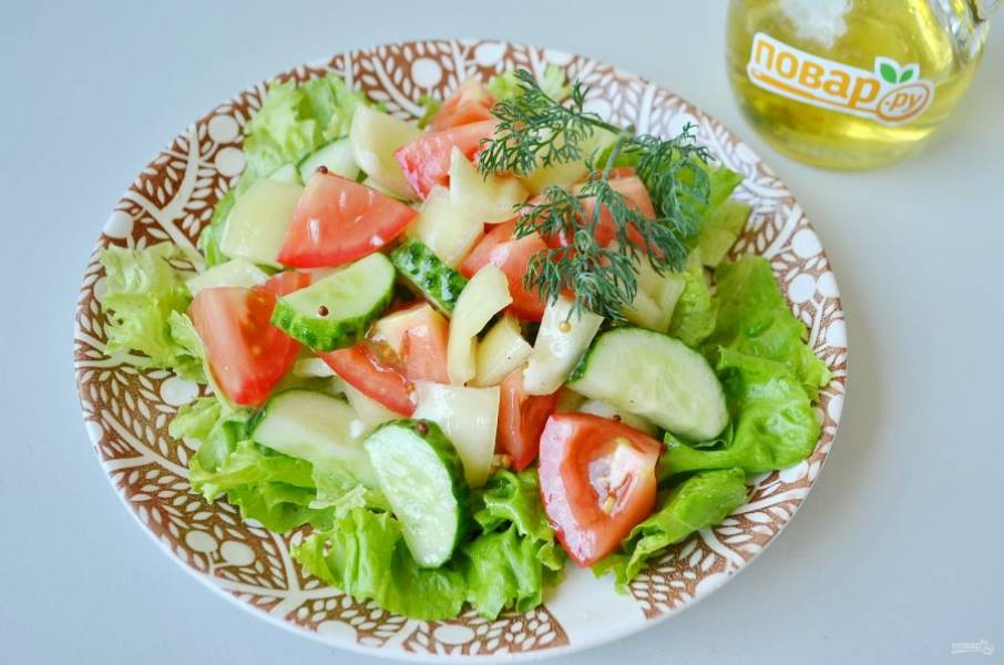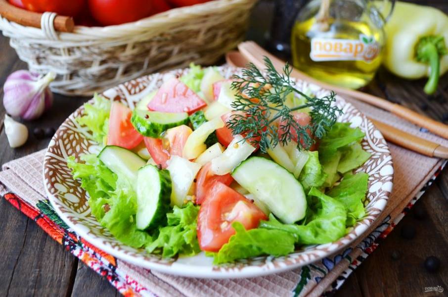 Рецепт салат овощной - приготовление овощного салата с огурцами, помидорами и майонезом. Этот вкусный и здоровый салат особенно любим в Греции.