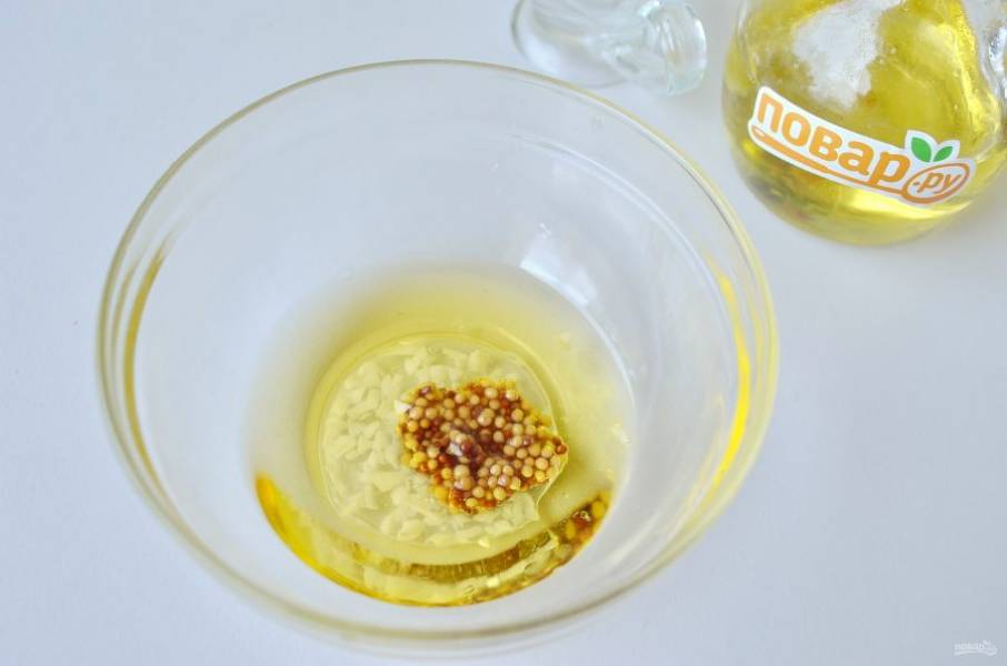3. Сделайте заправку для салата: соедините масло, уксус, горчицу и рубленный чеснок.