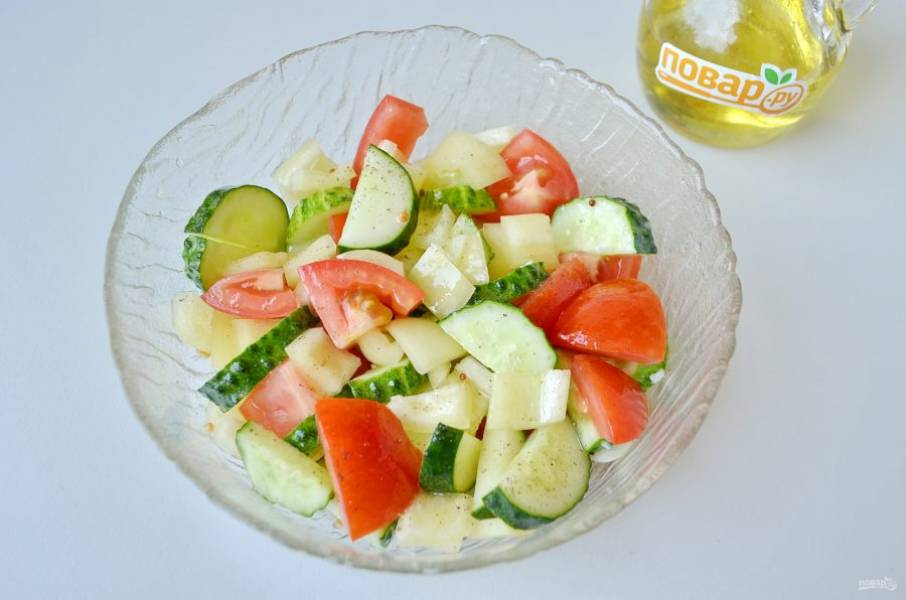 4. Перемешайте овощи с заправкой. Соль и перец черный молотый добавьте по вкусу. Я положила по щепотке.