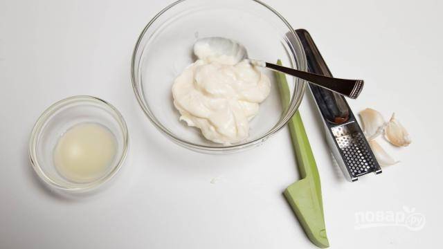 3. Для приготовления заправки соедините майонез с пропущенным через пресс чесноком и соком лимона. Заправку выложите в салат непосредственно перед подачей, чтобы овощи оставались свежими и хрустящими.